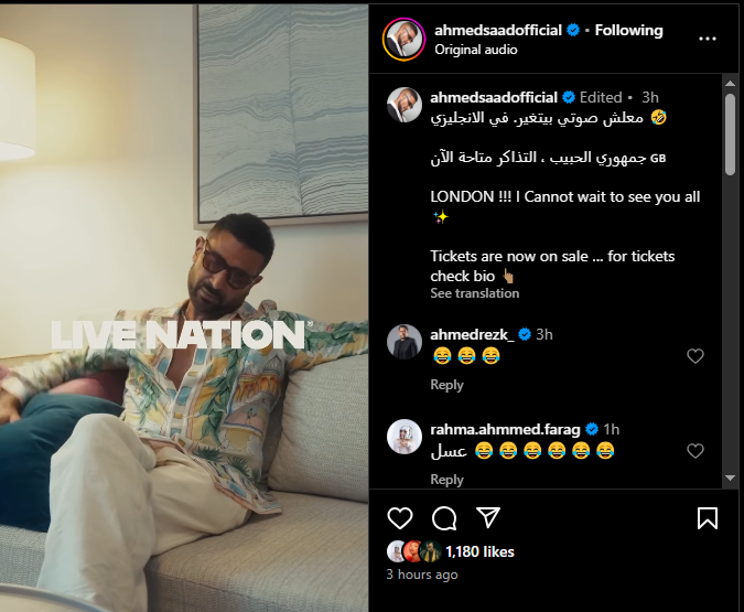 ونشر الفنان أحمد سعد، فيديو له وهو يروج لحلفه المقبل في لندن، وفقا لما رصده موقع تحيا مصر، عبر صفحته الرسمية على موقع التواصل الاجتماعي إنستجرام قال فيه: أنا متحمس جدا أعلن عن اول حفلة ليا في لندن يوم 13 نوفمبر، مش قادر استنى نعيش أحلى ليلة مع بعض.