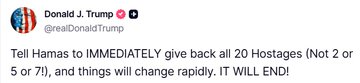 وكتب ترامب في منشور عبر منصة تروث سوشيال"أطلبوا من حماس أن تُعيد جميع الرهائن العشرين فورًا (وليس اثنين أو خمسة أو سبعة!)، وستتغير الأمور بسرعة. سينتهي هذا!" هذا ما نشره على صفحته على "الحقيقة الاجتماعية".