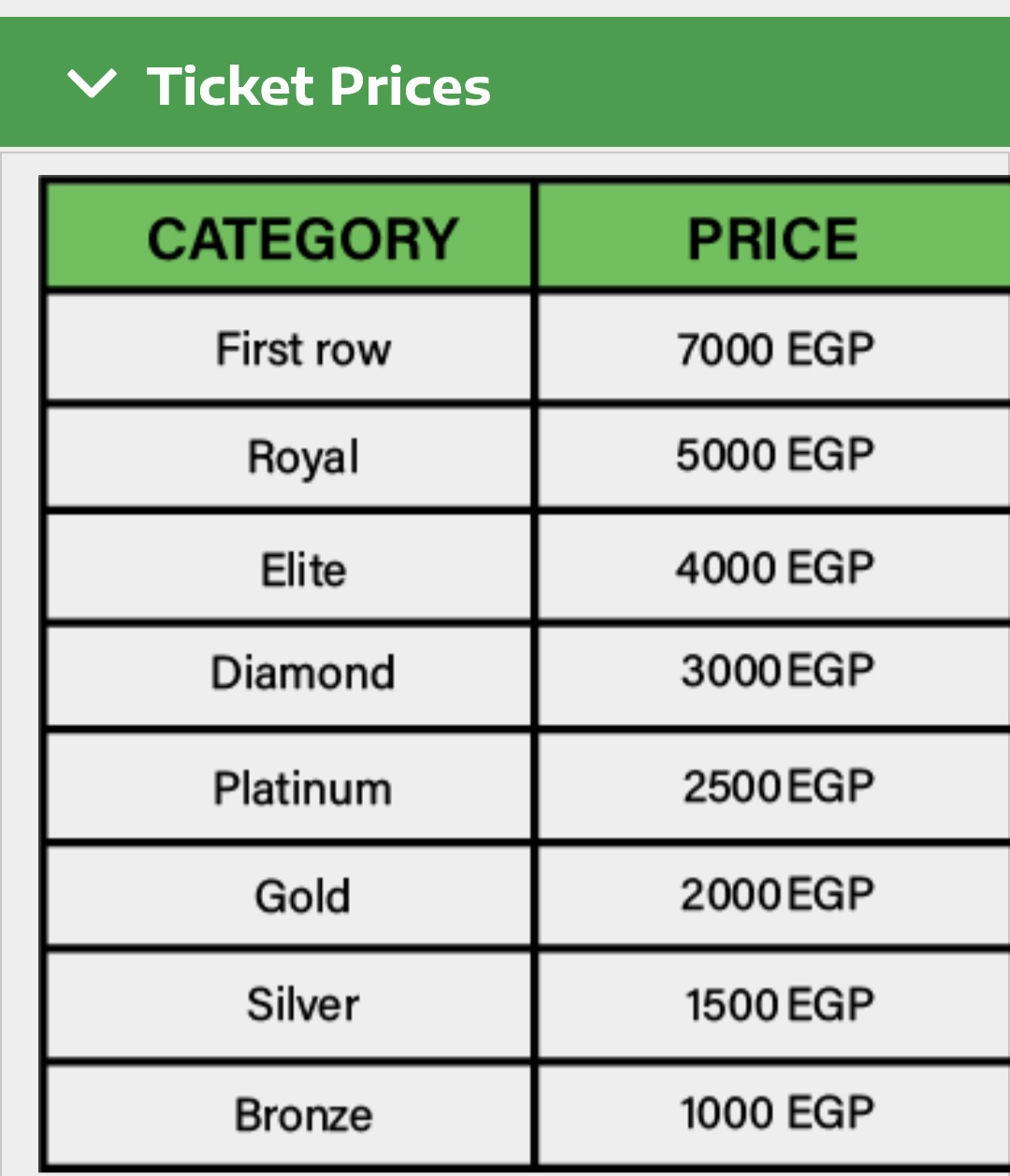 أعلنت الجهة المنظمة للحفل عن طرح تذاكر الحفل بفئات متعددة تناسب شرائح مختلفة من الجمهور، حيث جاءت الأسعار التي رصدها موقع تحيا مصر كالتالي: