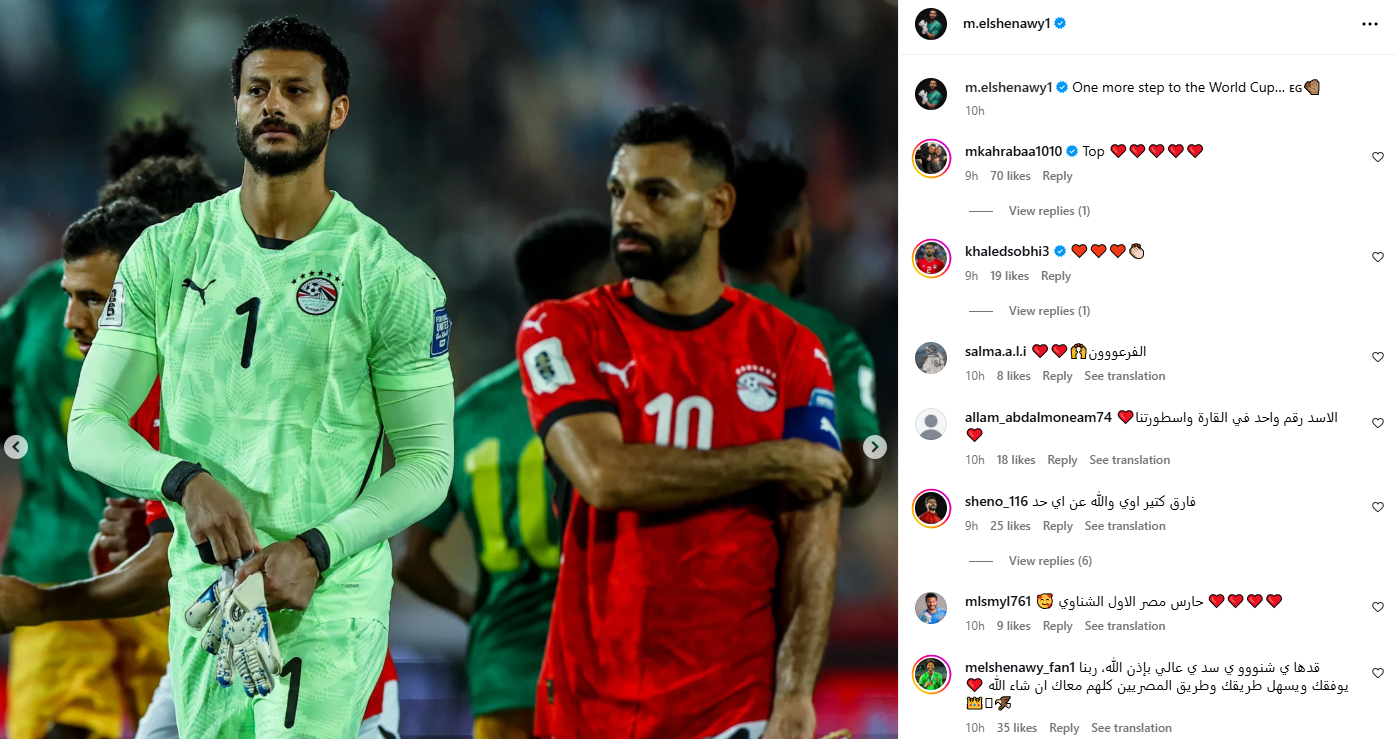 وكتب محمد الشناوي حارس المنتخب الوطني عبر حسابه الرسمي"فيس بوك": خطوة أخري نحو كأس العالم".
