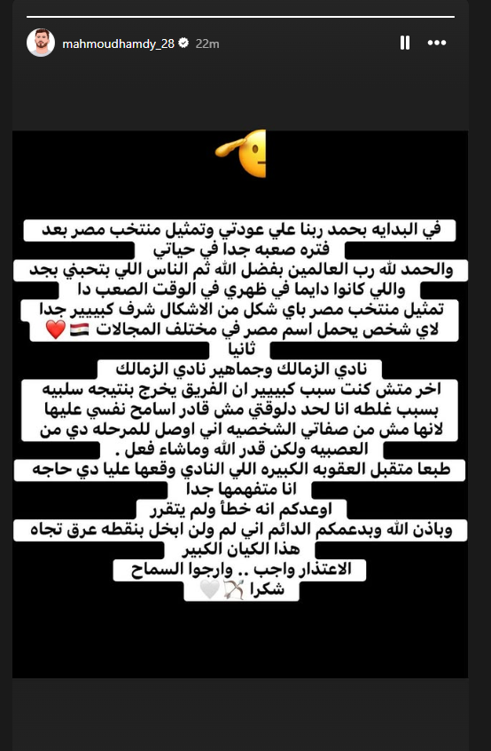 وتابع قائلاً:" والحمدلله رب العالمين بفضل الله ثم الناس اللي بتحبني بجد، واللي كانوا دايماً فى ظهري فى الوقت العصب دا، تمثيل منتخب مصر باي شكل من الاشكال شرف كبير جداً، لأي شخص يحمل اسم مصر فى مختلف المجالات".
