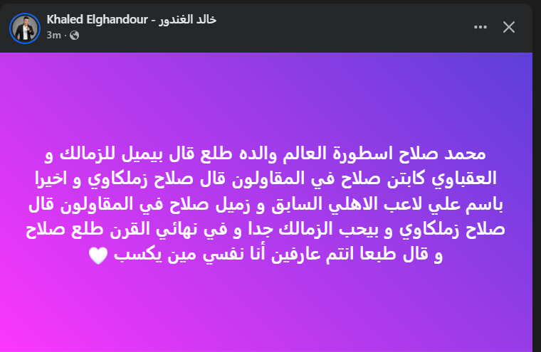 تحيا مصر، وكتب خالد الغندور عبر حسابه الرسمي"فيس بوك": محمد صلاح أسطورة العالم والده طلع قال بيميل للزمالك، و العقباوي كابتن صلاح في المقاولون قال صلاح زملكاوي و اخيراً باسم علي لاعب الاهلي السابق، و زميل صلاح في المقاولون قال صلاح زملكاوي و بيحب الزمالك جدا و في نهائي القرن طلع صلاح و قال طبعا انتم عارفين أنا نفسي مين يكسب".