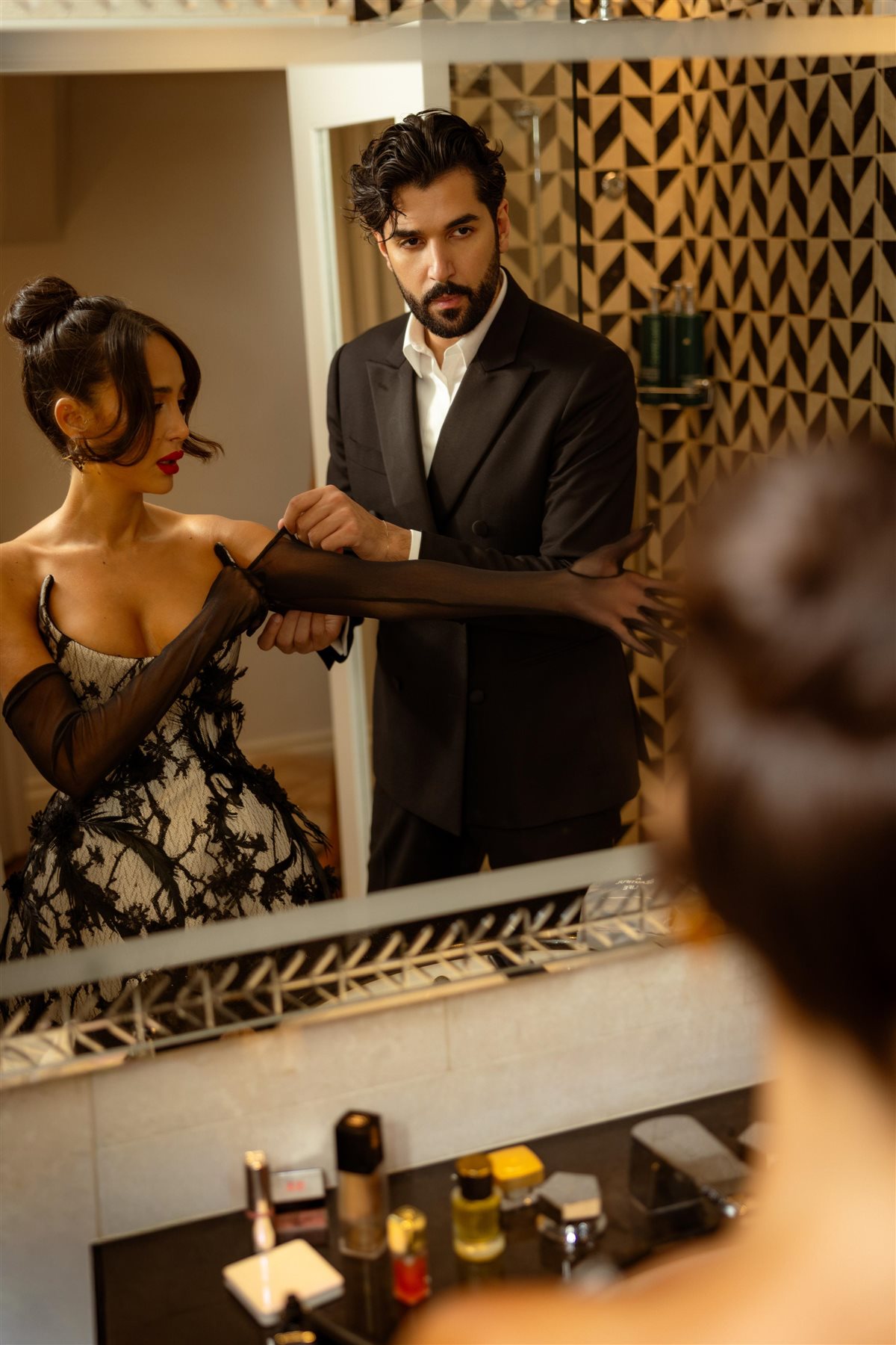 وواصلت بسمة بوسيل تألقها بإطلالة ساحرة تخطف الأنظار، حيث ارتدت فستانا أنيقا يحمل طابعا دراميا فاخرا، مزينا بتطريزات نباتية دقيقة من الريش الأسود على قاعدة بيضاء، ما أضفى على المظهر لمسة من الرقي والغموض، ونسقت معه قفازات طويلة شفافة باللون الأسود، زادت من فخامة الإطلالة، واختارت بسمة تسريحة شعر مرفوعة مع خصلات منسدلة ناعمة، وأكملت اللوك بمكياج ناعم أبرز جمال عينيها، وشفاه باللون الأحمر، كما تألقت كذلك بمجوهرات مميزة بأحجار لامعة عكست أناقتها المعتادة.