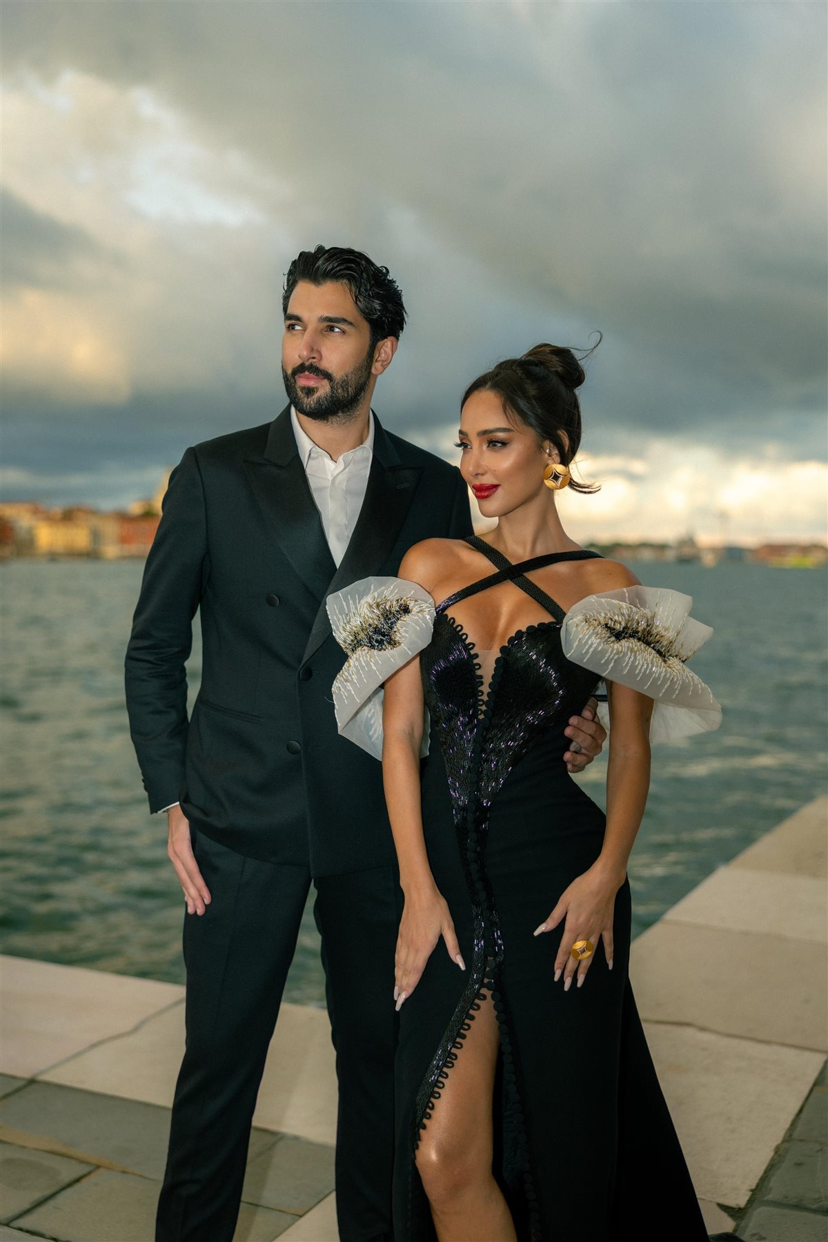 وفي واحدة من أكثر الإطلالات لفتًا للأنظار والتي رصدها موقع تحيا مصر، ظهرت بسمة بوسيل بفستان أسود أنيق بتصميم عصري جريء، تميز بأكمام ضخمة مزينة بتطريزات لامعة تجمع بين اللونين الأبيض والذهبي، مع فتحة أمامية طويلة أضفت لمسة من الجرأة والرقي، واختارت تسريحة شعر مرفوعة بإتقان، أبرزت ملامحها، وزينت الإطلالة بأقراط ذهبية كبيرة وخاتم بنفس التصميم، ما أضفى طابعا ملكيا على إطلالتها.