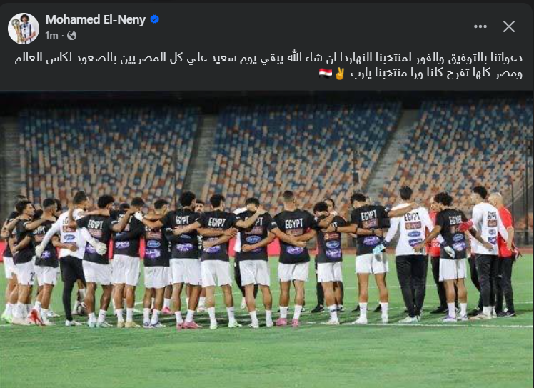 تحيا مصر، وكتب محمد النني عبر حسابه الرسمي"فيس بوك": دعواتنا بالتوفيق، والفوز لمنتخبنا النهاردة إن شاء الله يبقي يوم سعيد علي كل المصريين بالصعود لكأس العالم، ومصر كلها تفرح كلنا ورا منتخبنا يارب".