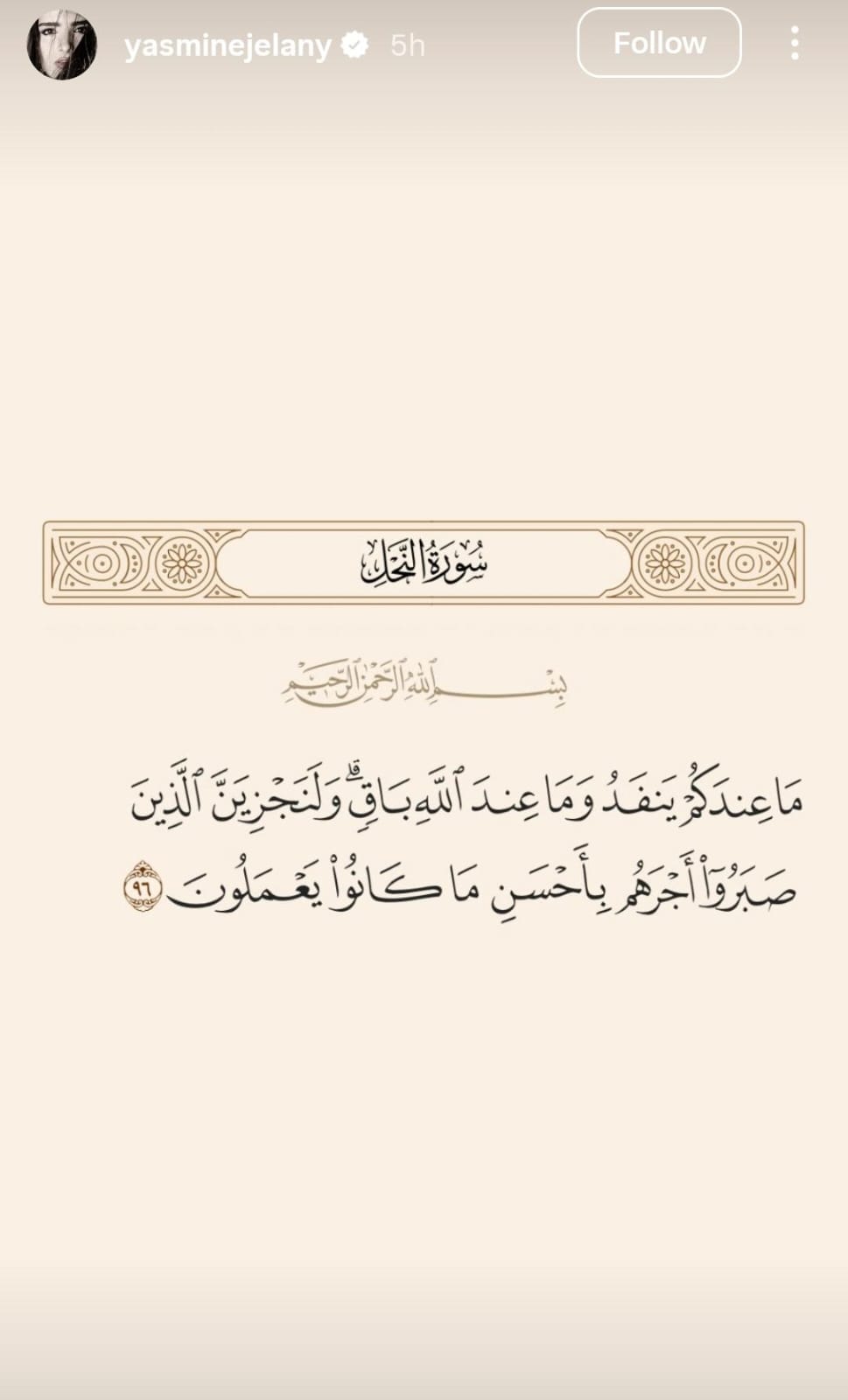 في أول تعليق لها بعد إعلان طلاقها من الفنان عمر خورشيد، نشرت الفنانة ياسمين جيلان عبر خاصية "الستوري" على حسابها الرسمي على إنستجرام آية قرآنية من سورة النحل تقول: "ما عِندَكُم يَنفَدُ وَما عِندَ اللَّهِ باقٍ وَلَنَجزِيَنَّ الَّذينَ صَبَروا أَجرَهُم بِأَحسَنِ ما كانوا يَعمَلونَ".