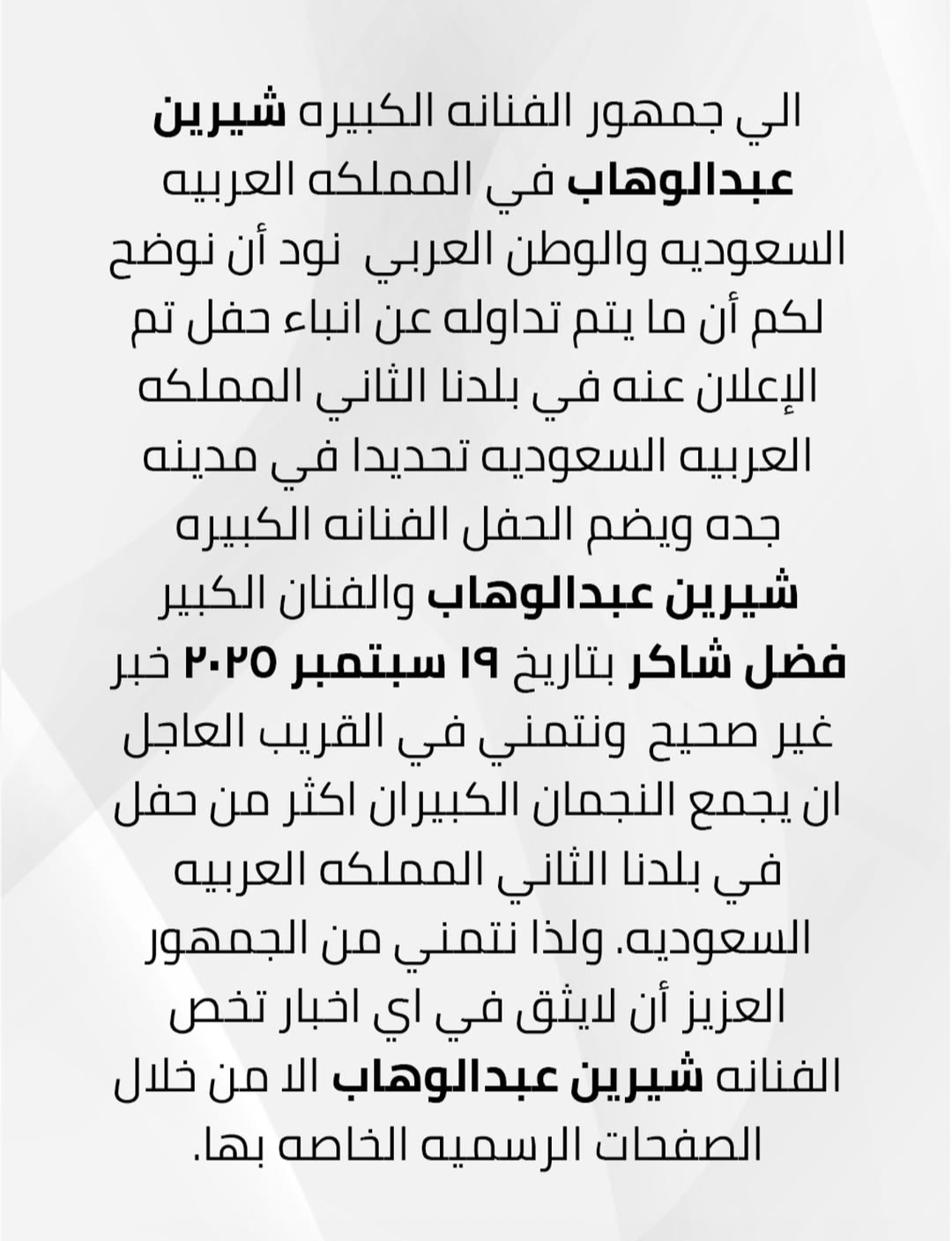وقالت شيرين عبد الوهاب في بيان رسمي نشرته صفحاتها الرسمية عبر مواقع التواصل الاجتماعي المختلفة ورصده موقع تحيا مصر: "إلى جمهور الفنانة الكبيرة شيرين عبد الوهاب في المملكة العربية السعودية والوطن العربي، نود أن نوضح لكم أن ما يتم تداوله عن أنباء حفل تم الإعلان عنه في بلدنا الثاني المملكة العربية السعودية، تحديدًا في مدينة جدة، ويضم الحفل الفنانة الكبيرة شيرين عبد الوهاب والفنان الكبير فضل شاكر بتاريخ ١٩ سبتمبر ٢٠٢٥، خبر غير صحيح، ونتمنى في القريب العاجل أن يجمع النجمان الكبيران أكثر من حفل في بلدنا الثاني المملكة العربية السعودية، ولذا نتمنى من الجمهور العزيز أن لا يثق في أي أخبار تخص الفنانة شيرين عبد الوهاب إلا من خلال الصفحات الرسمية الخاصة بها."