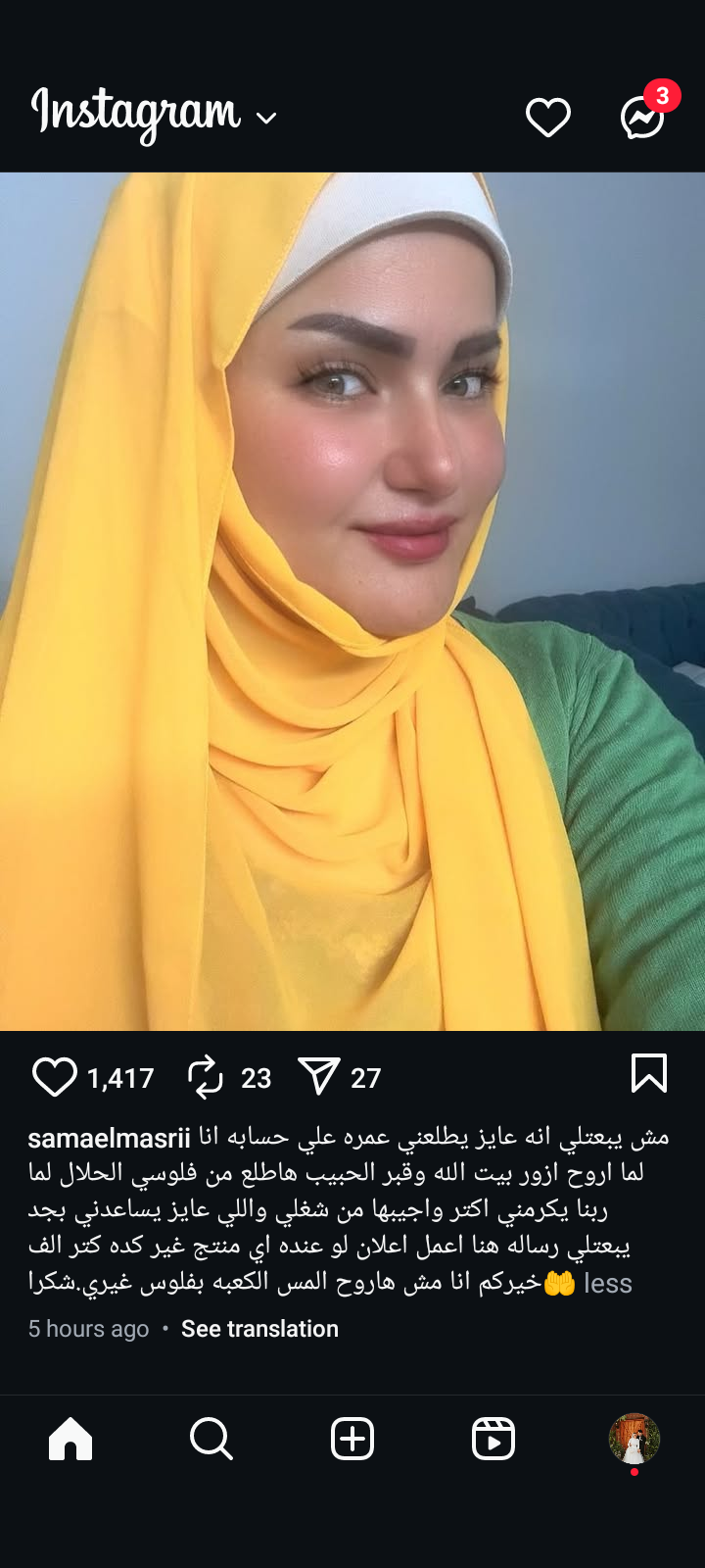 وكتبت سما المصري في منشور رصده موقع تحيا مصر عبر حسابها الرسمي بموقع تبادل الصور والفيديوهات انستجرام:مش يبعتلي انه عايز يطلعني عمره علي حسابه انا لما اروح ازور بيت الله وقبر الحبيب ها طلع من فلوسي الحلال لما ربنا يكرمني اكثر واجيبها من شغلي واللي عايز يساعدني بجد يبعتلي رساله هنا اعمل اعلان لو عنده اي منتج غير كده كتر الف خيركم انا مش هاروح المس الكعبه بفلوس غيري. شكرا.