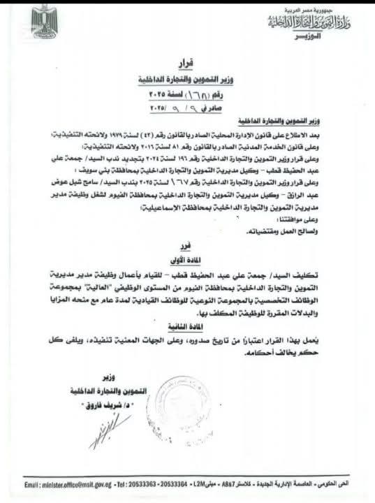 التموين تصدر قرار بتكليف مدير جديد لمديرية التموين بالفيوم