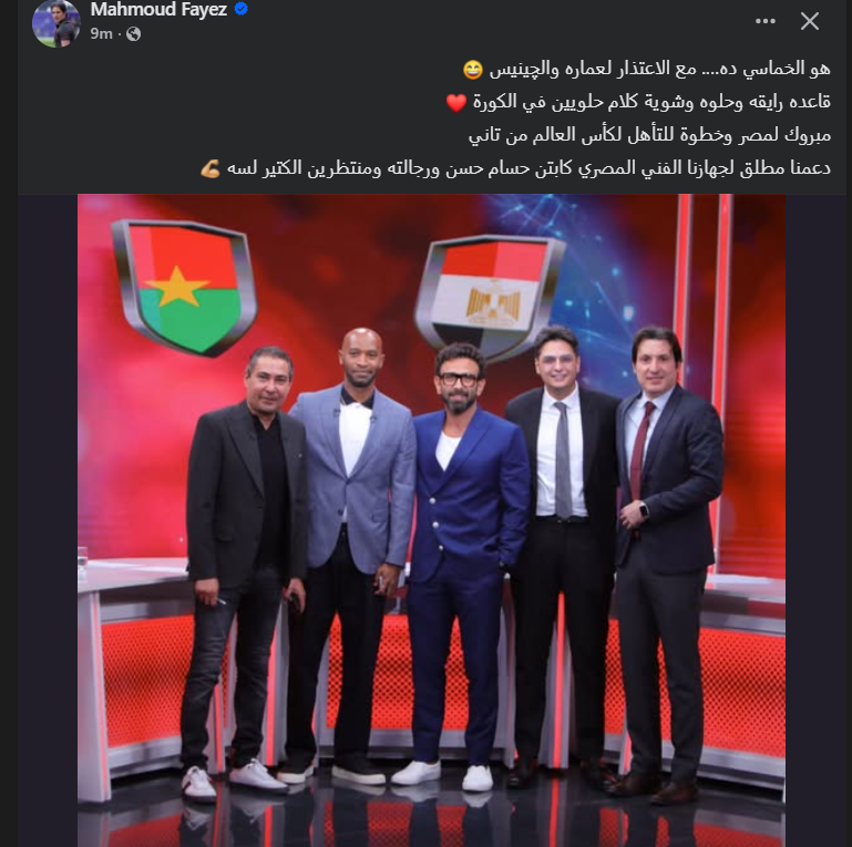 تحيا مصر، وكتب محمود فايز عبر حسابه الرسمي"فيس بوك":"قاعده رايقه وحلوه وشوية كلام حلويين في الكورة، مبروك لمصر وخطوة للتأهل لكأس العالم من تاني، دعمنا مطلق لجهازنا الفني المصري كابتن حسام حسن ورجالته ومنتظرين الكتير لسه".