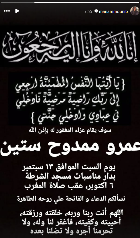 وكانت الفنانة الشابة مريم عامر منيب، قد أعنلت عن موعد عزاء خطبيها المطرب الراحل عمرو ستين، وفقا لما رصد موقع تحيا مصر، في استوري عبر صفحتها الرسمية بموقع التواصل الاجتماعي إنستجرام قائلة: سوف يقام عزاء المغفور له بإذن الله عمرو ممدوح ستين، يوم السبت الموافق 13 من سبتمبر، بدار مناسبات مسجد الشرطة بمدينة السادس من أكتوبر، عقب صلاة المغرب، نسألكم الدعاء والفاتحة على روحه الطاهرة.