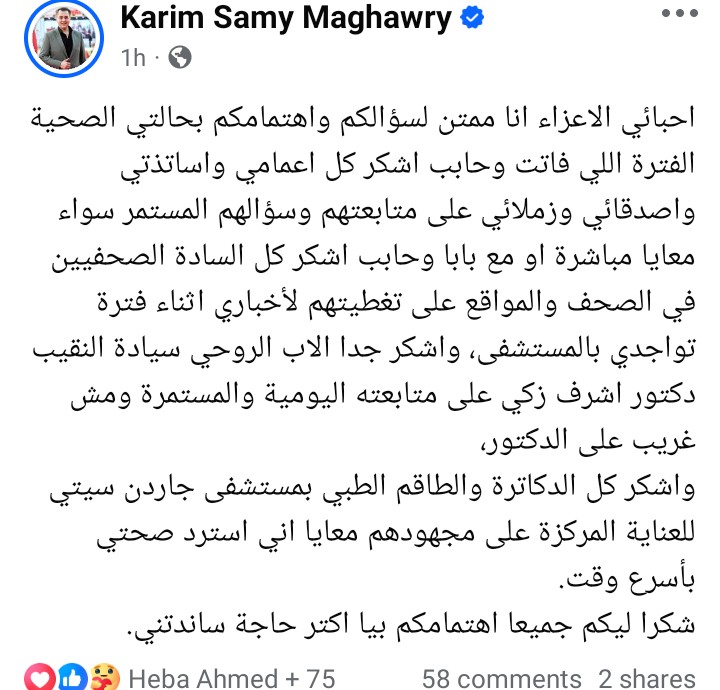 وتابع كريم سامي مغاوري حديثه، قائلا: وأشكر جدا الاب الروحي سيادة النقيب دكتور اشرف زكي على متابعته اليومية والمستمرة ومش غريب على الدكتور، واشكر كل الدكاترة والطاقم الطبي بمستشفى جاردن سيتي للعناية المركزة على مجهودهم معايا اني استرد صحتي بأسرع وقت.. شكرا ليكم جميعا اهتمامكم بيا اكتر حاجة ساندتني.