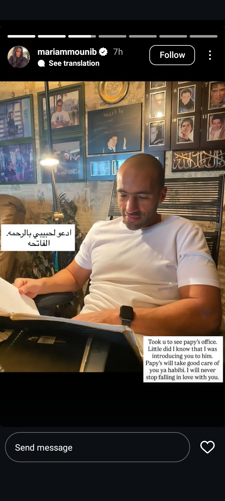 وكتبت مريم عامر منيب في منشور رصده موقع تحيا مصر على حسابها الرسمي بموقع تبادل الصور والفيديوهات انستجرام: وديتك تشوف أوضة بابا بس مكنتش اعرف اني بعرفك عليه، بابا هيهتم بيك يا حبيبي وأنا عمري ما هبطل أحبك.. ادعوا لحبيبي بالرحمة.