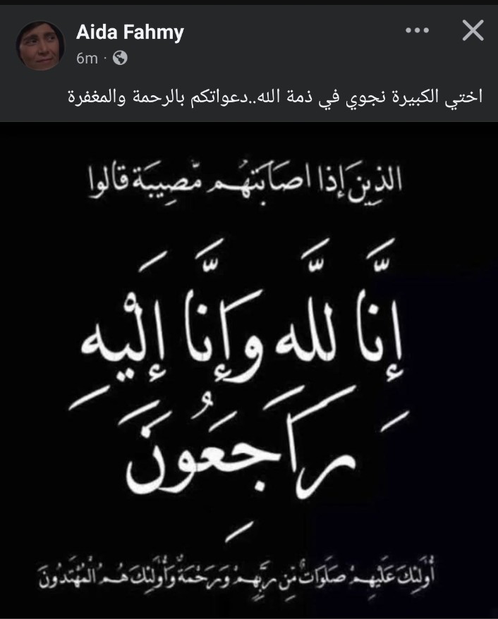 أعلنت الفنانة عايدة فهمي وفاة شقيقتها الكبرى وتُدعى نجوى، وذلك من خلال منشور عبر حسابها الشخصي على موقع التواصل الاجتماعي فيسبوك، وعبرت الفنانة عايدة فهمي عن حزنها بكلمات مؤثرة وطلبت من متابعيها الدعاء لشقيقتها الكبرى بالرحمة والمغفرة.