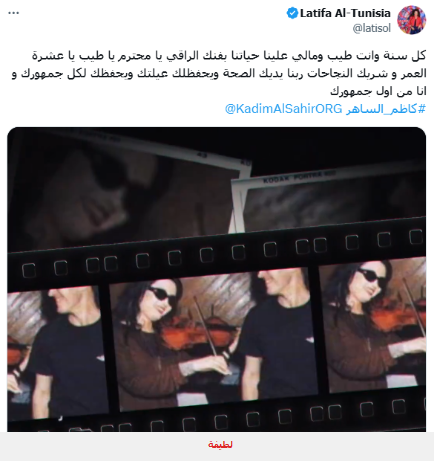 وكانت الفنانة التونسية لطيفة، قد شاركت مقطع فيديو يضم عدة لقطات من أعمالها الفنية مع النجم كاظم الساهر، وفقا لما رصده موقع تحيا مصر، وذلك عبر صفحتها الرسمية على موقع التواصل الاجتماعي أكس قائلة: كل سنة وانت طيب، ومالي حياتنا بفنك الراقي يا محترم، يا طيب، يا عشرة العمر وشريك النجاحات، ربنا يديك الصحة، ويحفط لك عيلتك، ويخفظلك جمهورك، وأنا من أول جمهورك.