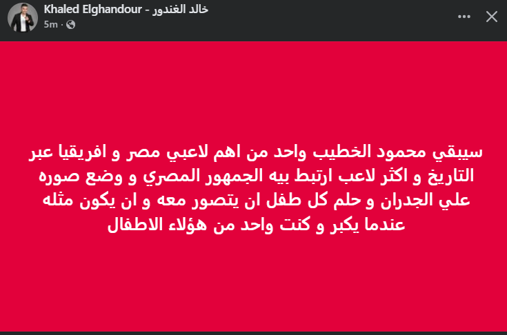 تحيا مصر، وكتب خالد الغندور عبر حسابه الرسمي"فيس بوك": سيبقي محمود الخطيب، واحد من أهم لاعبي مصر و أفريقيا عبر التاريخ، و اكثر لاعب ارتبط بيه الجمهور المصري، و وضع صوره علي الجدران، و حلم كل طفل أن يتصور معاه، و أن يكون مثله عندما يكبر، و كنت واحد من هؤلاء الاطفال".