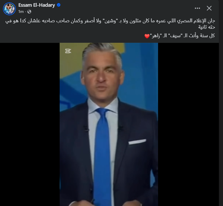 تحيا مصر، وكتب عصام الحضري عبر حسابه الرسمي"فيس بوك":جان الإعلام المصري اللي عمره ما كان متلون ولا بـ "وشين" ولا أصفر وكمان صاحب صاحبه علشان كدا هو في حته تانية كل سنة وأنت الـ "سيف" الـ "زاهر".