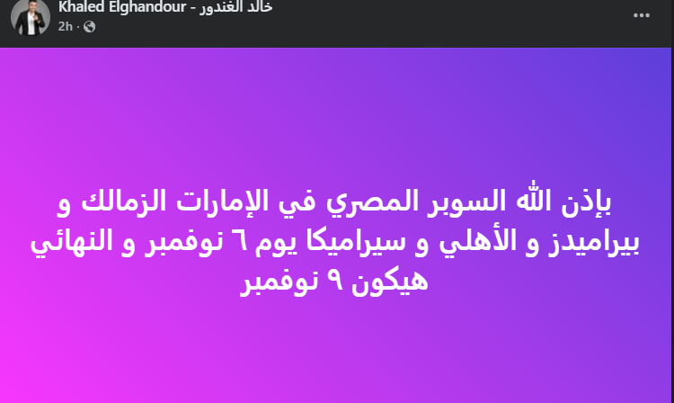 تحيا مصر، وكتب خالد الغندور عبر حسابه الرسمي"فيس بوك": بإذن الله السوبر المصري في الإمارات الزمالك، و بيراميدز و الأهلي و سيراميكا يوم ٦ نوفمبر و النهائي هيكون ٩ نوفمبر".