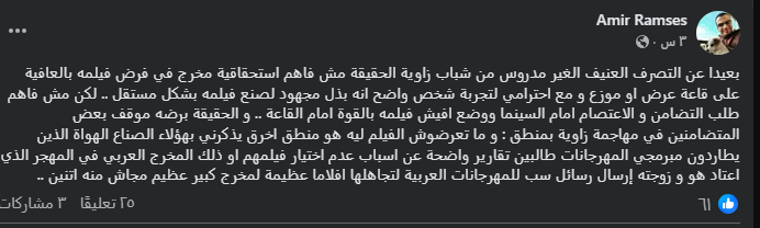 وكتب المخرج أمير رمسيس، مستنكر تصرف مخرج شاب، وفقا لما رصده موقع تحيا مصر، في منشور عبر موقع التواصل الاجتماعي فيسبوك قائلا: بعيدا عن التصرف العنيف غير مدروس من شباب زاوية الحقيقة مش فاهم استحقاقية مخرج في فرض فيلمه بالعافية قاعة عرض او موزع، مع احترامي لتجربة شخص واضح انه بذل مجهود لصنع فيلمه بشكل مستقل، لكن مش فاهم طلب التضامن والاعتصام أما السينما ووضع افيش فيلمه بالقوة امام القاعة.