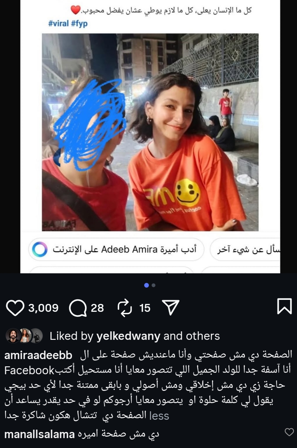 وقالت أميرة أديب عبر حسابها الرسمي على موقع تبادل الصور والفيديوهات انستجرام، موضحة الموقف وحقيقة المنشور الذي أثار الجدل وعرضها لانتقادات لاذعة: "الصفحة اللي نزلت البوست مش بتاعتي، وأنا ما عنديش صفحة على الفيسبوك، آسفة جدًا للولد الجميل اللي اتصور معايا، أنا مستحيل أكتب حاجة زي دي، دي مش أخلاقي ومش من أصلي."