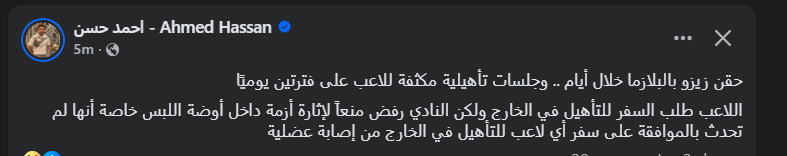 تحيا مصر، وكتب أحمد حسن عبر حسابه الرسمي"فيس بوك": حقن زيزو بالبلازما خلال أيام .. وجلسات تأهيلية مكثفة للاعب على فترتين يوميًا".