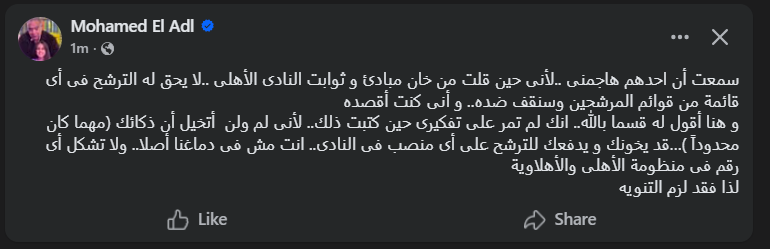 تحيا مصر، وكتب محمد العدل عبر حسابه الرسمي"فيس بوك":" سمعت أن احدهم هاجمنى، لأنى حين قلت من خان مبادئ و ثوابت النادى الأهلى، لا يحق له الترشح فى أى قائمة من قوائم المرشحين وسنقف ضده، وأنى كنت أقصده و هنا أقول له قسماً بالله انك لم تمر على تفكيرى حين كتبت ذلك".