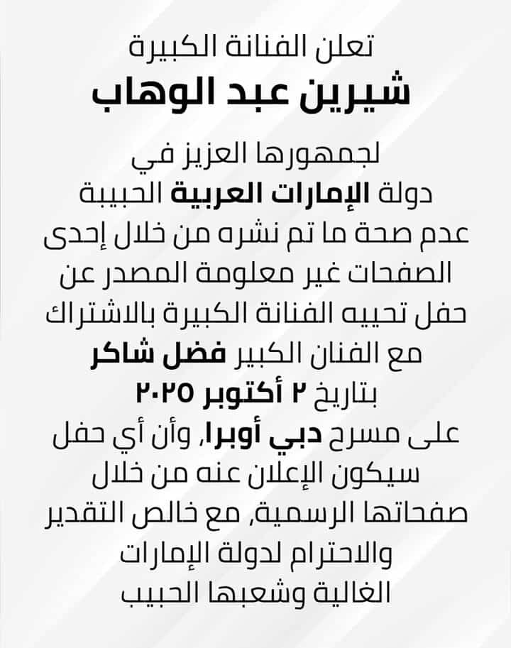 وجاء في نص البيان الذي نشرته شيرين ويرصده موقع تحيا مصر: “تعلن الفنانة الكبيرة شيرين عبد الوهاب لجمهورها العزيز في دولة الإمارات العربية الحبيبة عدم صحة ما تم نشره من خلال إحدى الصفحات غير معلومة المصدر عن حفل تحييه الفنانة الكبيرة بالاشتراك مع الفنان الكبير فضل شاكر بتاريخ ٢ أكتوبر ٢٠٢٥ على مسرح دبي أوبرا، وأن أي حفل سيكون الإعلان عنه من خلال صفحاتها الرسمية، مع خالص التقدير والاحترام لدولة الإمارات الغالية وشعبها الحبيب”، وأكدت شيرين عبد الوهاب أن أي ارتباط فني مستقبلي سيتم الإعلان عنه بشكل رسمي وواضح عبر حساباتها الرسمية فقط، دون الاعتماد على مصادر غير موثوقة أو صفحات غير معروفة.