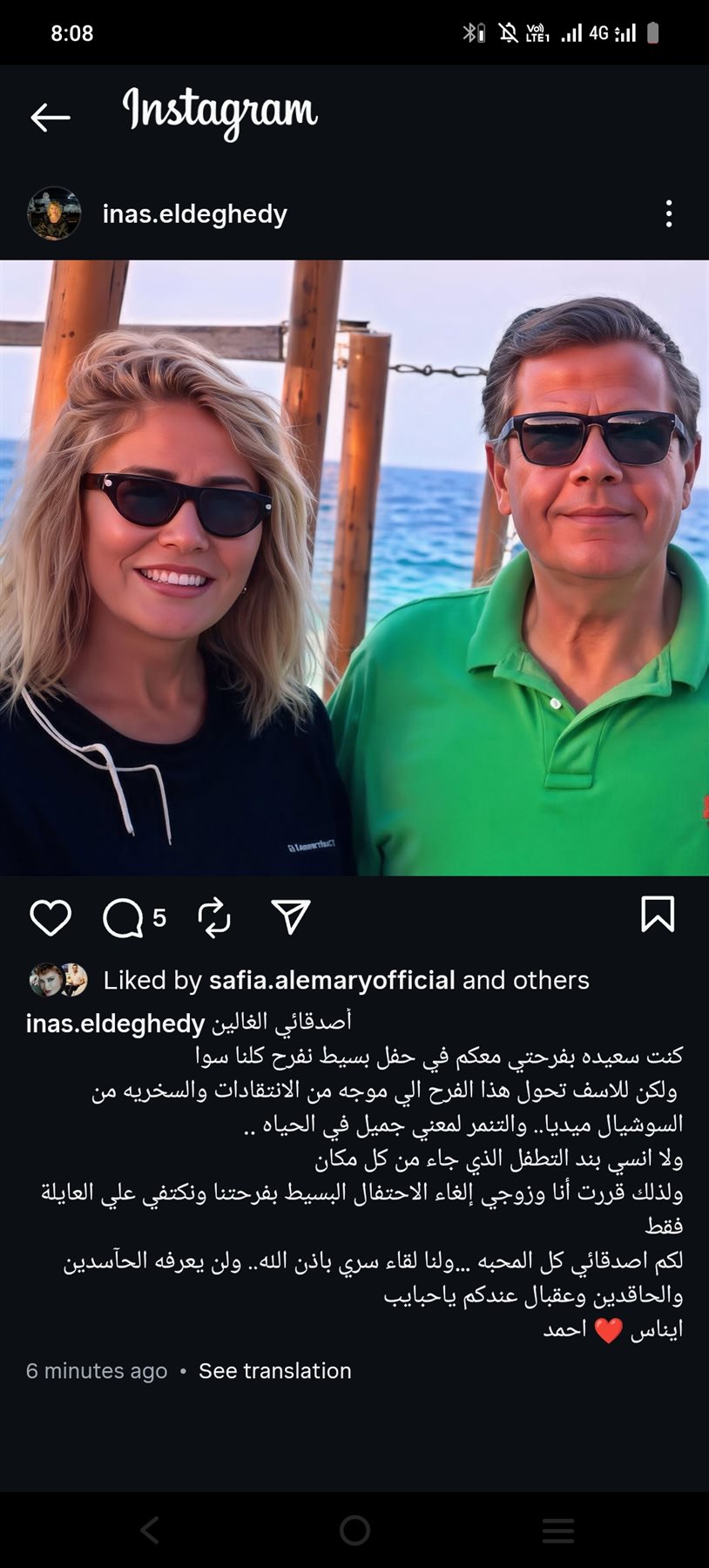 وقالت إيناس الدغيدي في منشور عبر حسابها على موقع تبادل الصور والفيديوهات انستجرام والذي رصده موقع تحيا مصر: "أصدقائي الغالين، كنت سعيده بفرحتي معكم في حفل بسيط نفرح كلنا سوا ولكن للاسف تحول هذا الفرح الي موجه من الانتقادات والسخريه من السوشيال ميديا.. والتنمر لمعني جميل في الحياه، ولا انسي بند التطفل الذي جاء من كل مكان ولذلك قررت أنا وزوجي إلغاء الاحتفال البسيط بفرحتنا ونكتفي علي العايلة فقط، لكم اصدقائي كل المحبه ... ولنا لقاء سري باذن الله .. ولن يعرفه الحاسدين والحاقدين وعقبال عندكم يا حبايب".