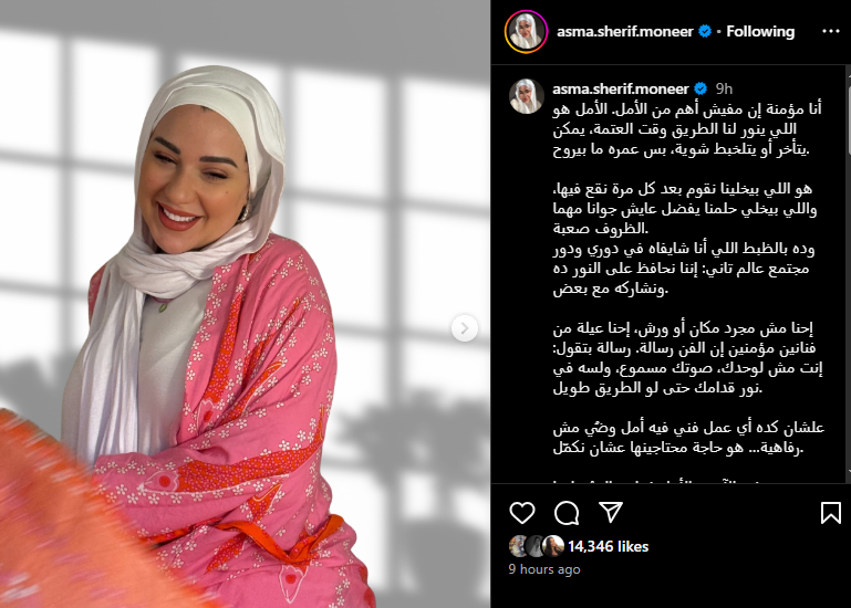 كما طلبت اسما شريف منير، من جمهورها الدعاء بالثبات أنها مازالت في بداية هذه الرحلة الروحية وتحتاج إلى دعم معنوي ومساعدة في اختيار ملابس محتشمة تتماشي مع قرارها الجديد، مضيفة: ادعولي بالثبات، ومحتاجة أماكن فيها لبس حلة يساعدني اكمل الطريق ده.