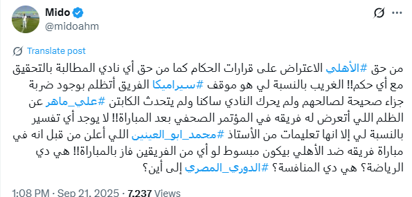 تحيا مصر، وكتب ميدو عبر حسابه الرسمي"أكس": من حق الأهلي الاعتراض على قرارات الحكام كما من حق أي نادي المطالبة بالتحقيق مع أي حكم الغريب بالنسبة لي هو موقف سيراميكا الفريق أتظلم بوجود ضربة جزاء صحيحة لصالحهم ولم يحرك النادي ساكنا ولم يتحدث الكابتن علي ماهر عن الظلم اللي أتعرض له فريقه في المؤتمر الصحفي بعد المباراة".