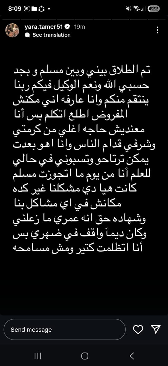 نشرت البلوجر يارا تامر عبر خاصية "الستوري" على حسابها الرسمي بموقع إنستجرام الذي يرصده موقع تحيا مصر رسالة مؤثرة أكدت فيها وقوع الطلاق، مشيرة إلى أنها كانت تتجنب الحديث في الأمر احترامًا للخصوصية لكنها شعرت بضرورة التوضيح بعد ما تعرضت له من ضغوط، وقالت يارا في تعليقها: "تم الطلاق بيني وبين مسلم و بجد حسبي الله ونعم الوكيل فيكم ربنا ينتقم منكم وانا عارفه اني مكنش المفروض اطلع اتكلم بس أنا معنديش حاجه اغلي من كرمتي وشرفي قدام الناس وانا اهو بعدت يمكن ترتاحو وتسبوني في حالي للعلم أنا من يوم ما اتجوزت مسلم كانت هيا دي مشكلنا غير كده مكانش في اي مشاكل بنا وشهاده حق انه عمري ما زعلني وكان ديماً واقف في ضهري بس أنا اتظلمت كثير ومش مسامحه."