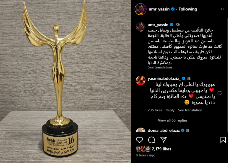 وشارك السيناريست والكاتب عمرو محمود ياسين، صورة للجائزة التي فاز بها كأفضل تأليف في مهرجان الفضائيات العربية، وفقا لما رصده موقع تحيا مصر، عبر صفحته الرسمية على موقع التواصل الاجتماعي إنستجرام وعلق عليها: جائزة التأليف عن مسلسل وتقابل حبيب، اهديها لصديقتي واختي الغالية، النجمة ياسيمن عبد العزيز، وبالمناسبة ياسمين كانت قد فازت بجائزة الجمهور كأفضل ممثلة، ولكن ظروف سفرها حالت دون استلامها للجائزة، مبروك عليكي يا حبيبتي، ودائما ناجحة ومكسرة الدنيا.