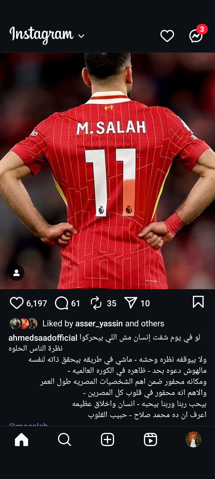 وقال أحمد سعد عن محمد صلاح في منشور رصده موقع تحيا مصر على حسابه الرسمي بموقع تبادل الصور والفيديوهات انستجرام: لو في يوم شفت إنسان مش اللي بيحركوا نظرة الناس الحلوه ولا بيوقفه نظره وحشه، ماشي في طريقه بيحقق ذاته لنفسه مالهوش دعوة بحد، ظاهرة في الكورة العالمية ومكانه محفور ضمن اهم الشخصيات المصريه طول العمر، والاهم انه محفور في قلوب كل المصرين بيحب ربنا وربنا بيحبه ، انسان واخلاق عظيمة اعرف ان ده محمد صلاح حبيب القلوب.