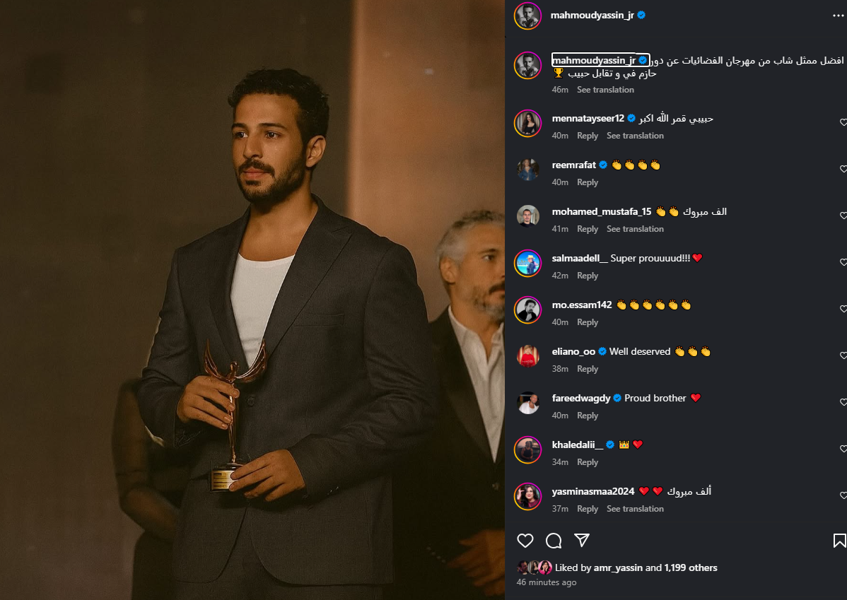وشارك الفنان الشاب محمود ياسين جونيور، صورة له خلال تكريمه في مهرجان الفضائيات العربية، وفقا لما رصده موقع تحيا مصر، عبر صفحته الرسمية على موقع التواصل الاجتماعي إنستجرام وعلق عليها: أفضل ممثل شاب من مهرجان الفضائيات عن دور حازن في وتقابل حبيب.