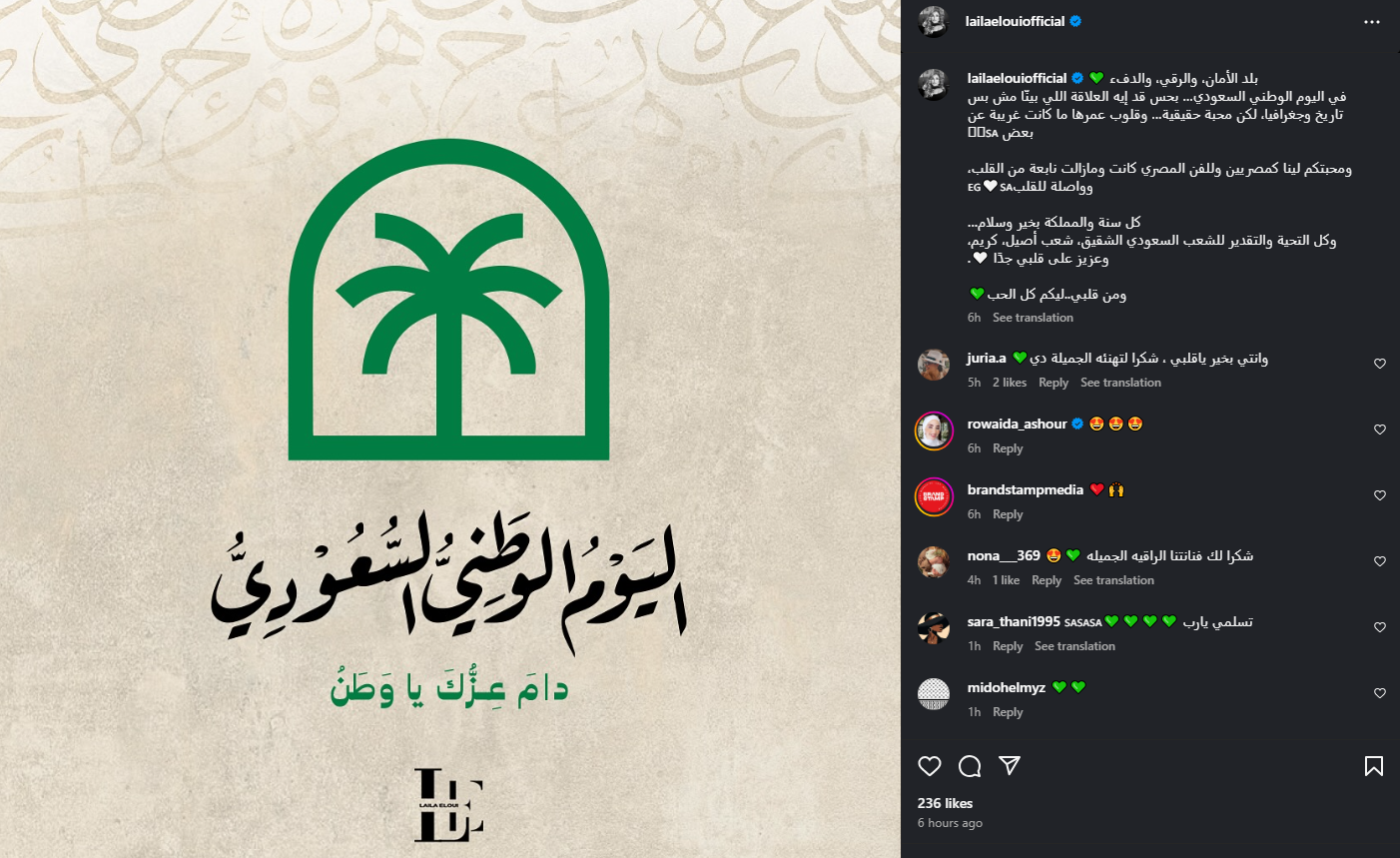 من قلبي ليكم كل الحب.. ليلى علوى تحتفل باليوم الوطني السعودي