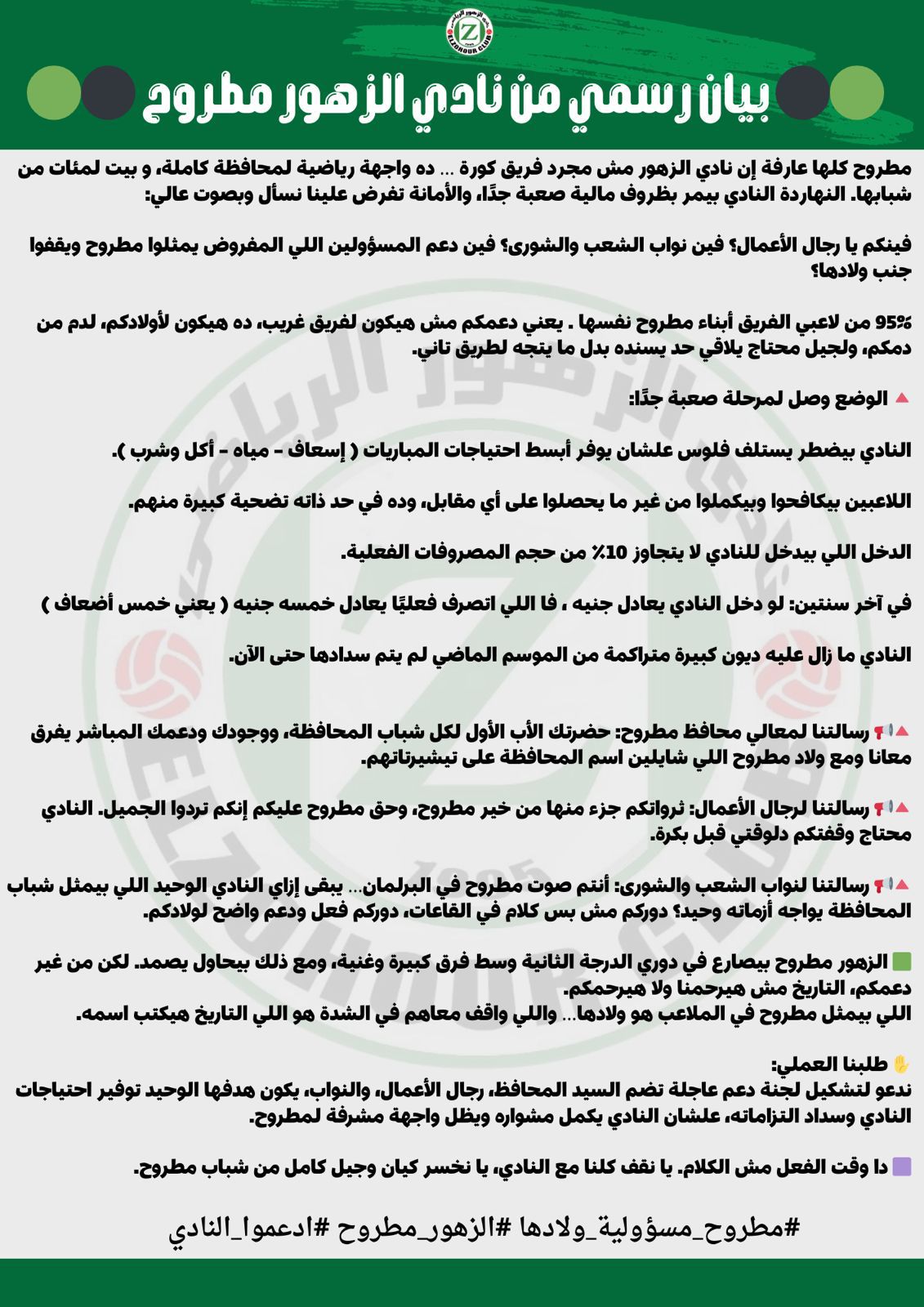 وبعث مسؤولو مجلس إدارة نادي الزهور بطروح برسالة خلال البيان إلي محافظ مطروح بصفته المسؤل الأول بالمحافظة والذي سيكون دعمه بمثابة تفجير لطاقات اللاعبين الذين ينتظرون تدخل المحافظ معهم لدعمهم معنويا بأنهم يرفعون شعار محافظة مطروح في دوري القسم الثاني مع مناشدة نواب البرلمان والشيوخ بدعم النادي ونقل أزمته المالية إلي المسؤلين بوزارة الشباب والرياضة مع مطالبة رجال الأعمال بالمحافظة بدعم الفريق الذي يمثل جميع أبناء المحافظة في مسابقة الدوري الممتاز ب مما يفرض علي الجميع التدخل في هذا الموقف الصعب حتي يظل التاريخ شاهدا علي من يقدم الدعم للنادي.