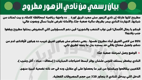 وشمل بيان مجلس إدارة نادي الزهور بمطروح أن النادي ليس فريق كرة قدم فقط بل يعد واجهة رياضية لأبناء وشباب محافظة مطروح والذي يمر بظروف مالية صعبة تفرض علي الجميع من محبي وأبناء المحافظة التدخل لإنقاذ النادي من الضياع خاصة رجال الأعمال والمسؤلين عن الرياضة لدعم النادي الذي يضم نسبة تفوق 95% من اللاعبين به من أبناء محافظة مطروح الذين سبوجه لهم الدعم وليس لأحد من خارج المحافظة.