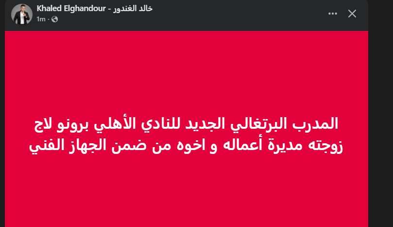 تحيا مصر، وكتب خالد الغندور عبر حسابه الرسمي"فيس بوك":" المدرب البرتغالي الجديد للنادي الأهلي برونو لاج زوجته مديرة أعماله و اخوه من ضمن الجهاز الفني".