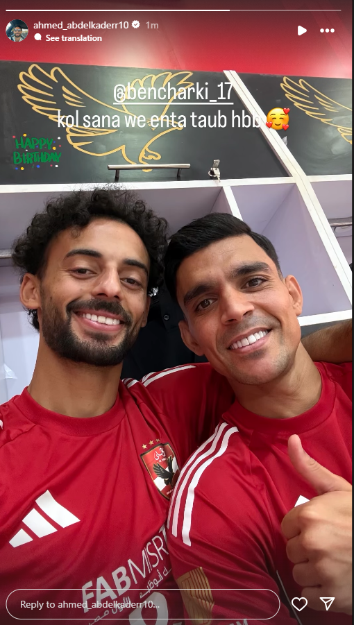 حرص أحمد عبد القادر لاعب الفريق الأول لكرة القدم بالنادي الأهلي، على تهنئة المغربي أشرف بن شرقي بمناسبة عيد ميلاده الـ31.