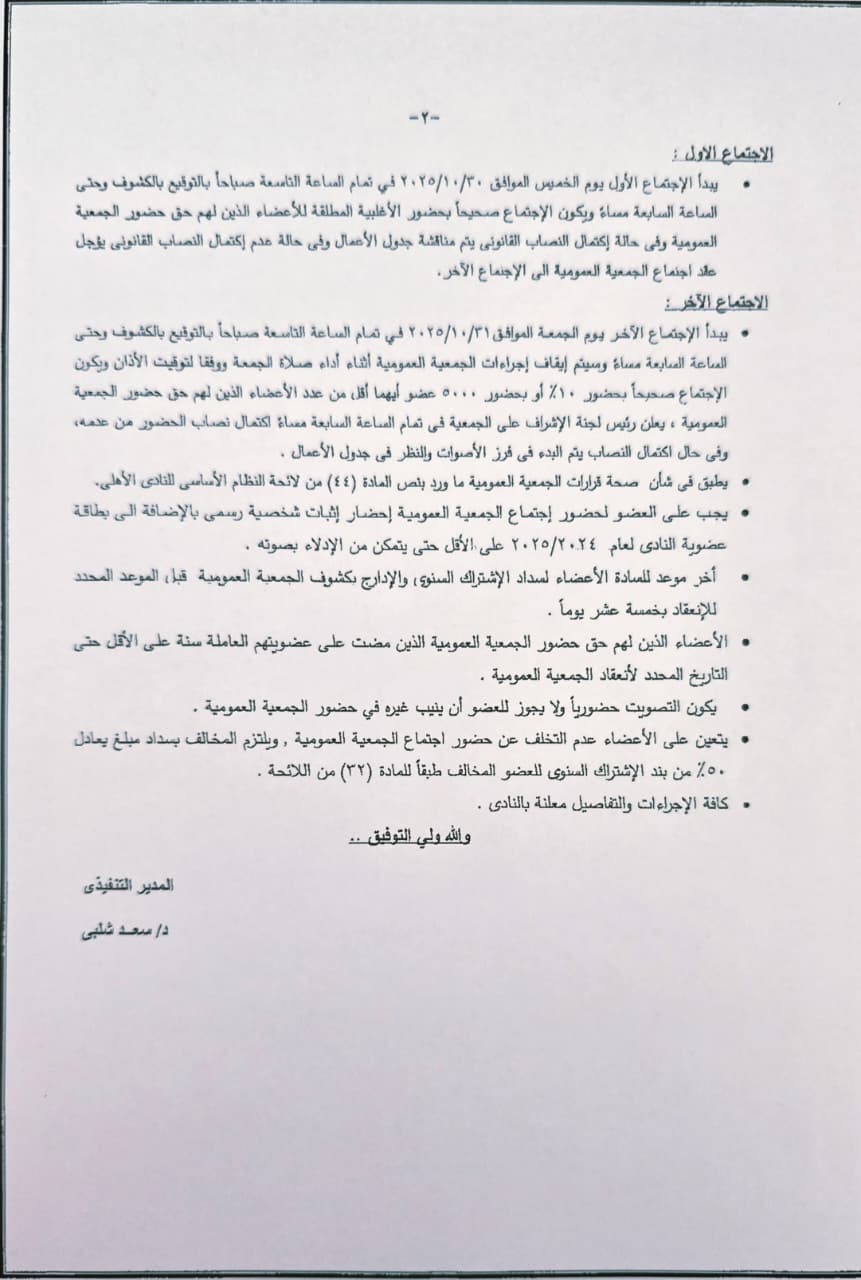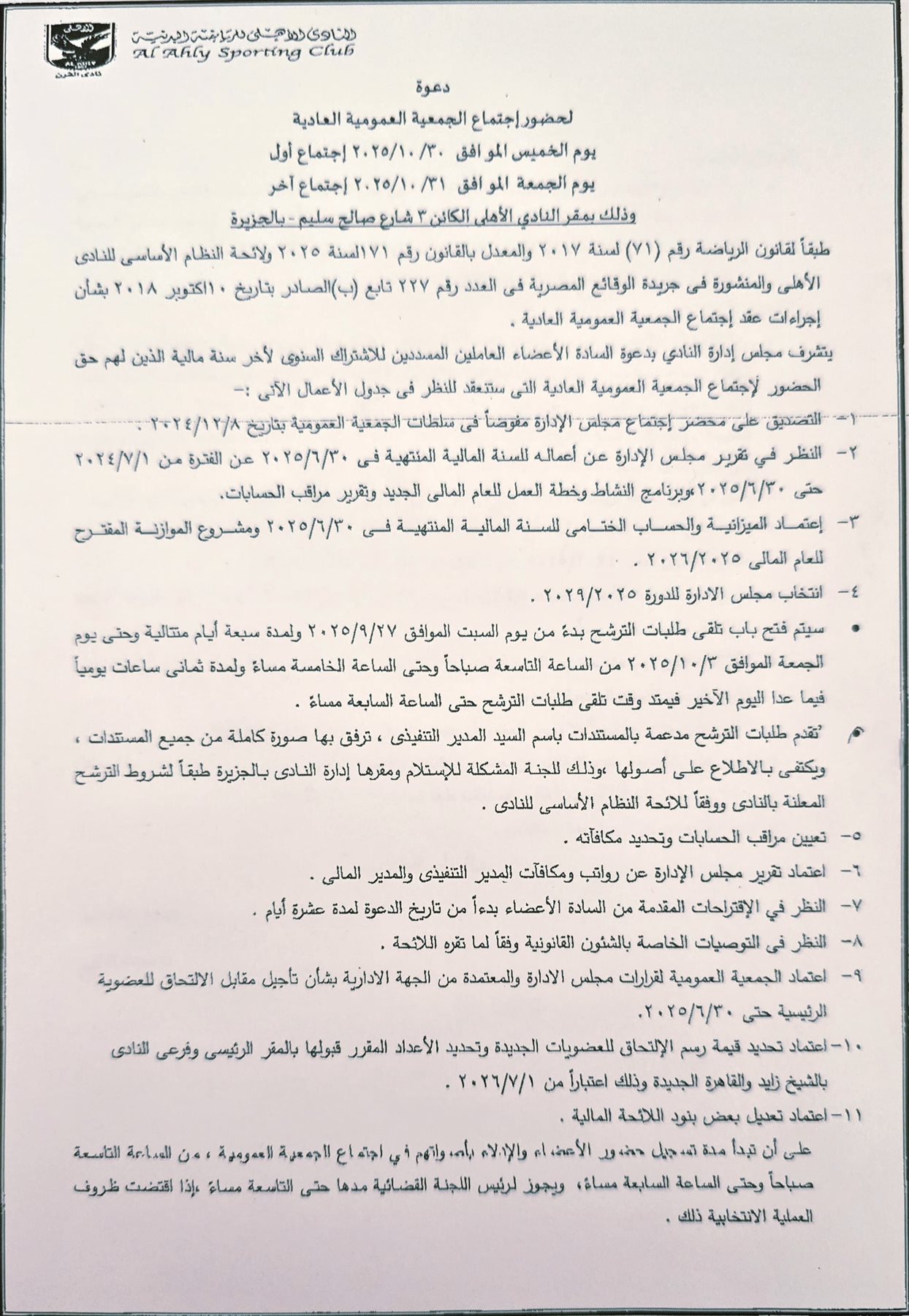 دعا مجلس إدارة النادي الأهلي السادة الأعضاء العاملين المسددين للاشتراك السنوى لآخر سنة مالية الذين لهم حق الحضور لاجتماع الجمعية العمومية العادية التى ستنعقد يومي 30 و31 أكتوبر المقبل؛ للنظر فى جدول الأعمال الآتي:-