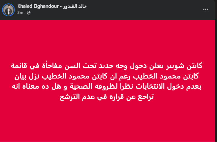 تحيا مصر، وكتب خالد الغندور عبر حسابه الرسمي"فيس بوك": كابتن شوبير يعلن دخول، وجه جديد تحت السن مفاجأة في قائمة كابتن محمود الخطيب رغم أن كابتن محمود الخطيب نزل بيان بعدم دخول الانتخابات نظرا لظروفه الصحية، وهل ده معناه انه تراجع عن قراره في عدم الترشح".