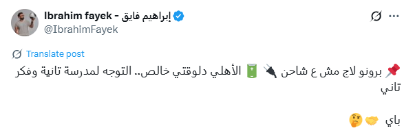 تحيا مصر، وكتب إبراهيم فايق عبر حسابه الرسمي"فيس بوك": برونو لاج مش على شاحن الأهلي دلوقتي خالص، التوجه لمدرسة تانية وفكر تاني".