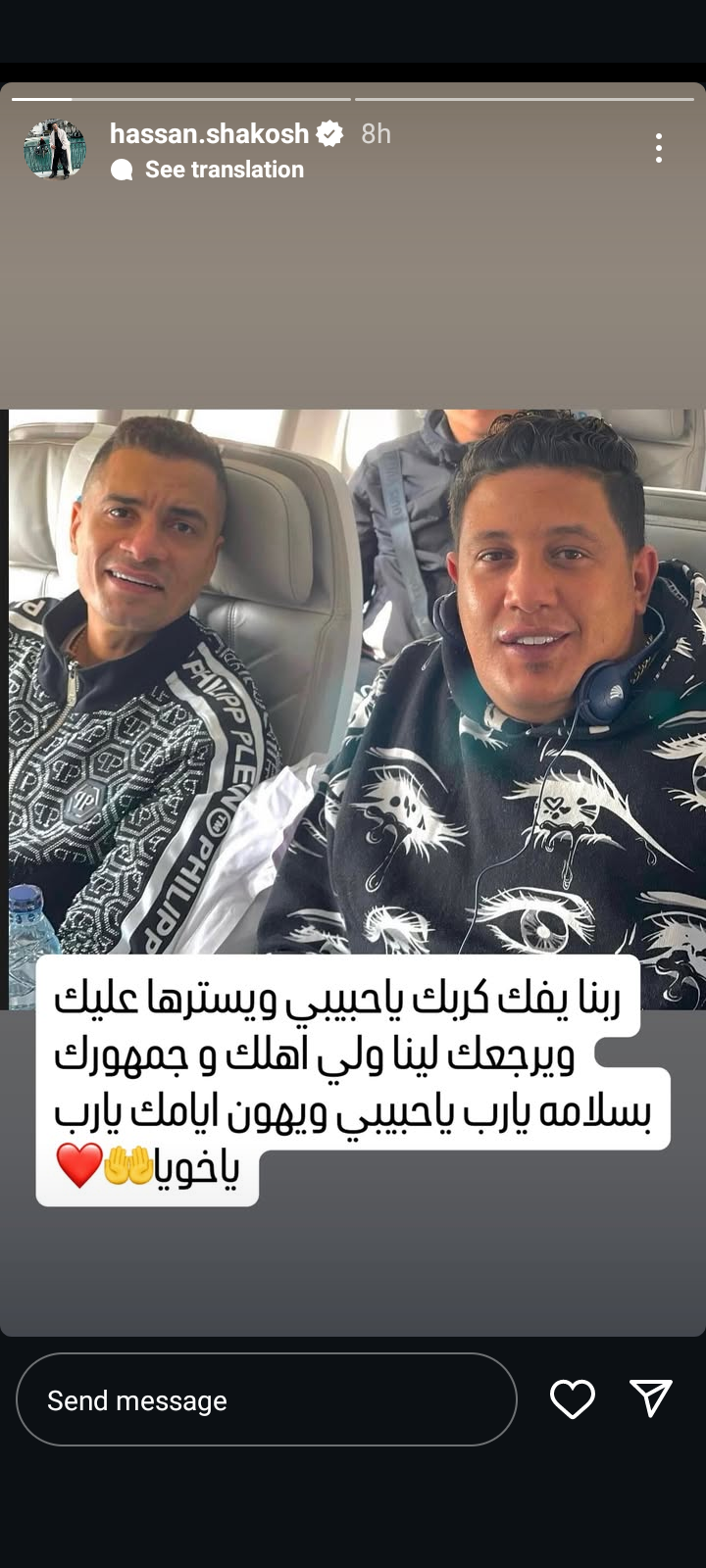 وكتبت حسن شاكوش في منشور رصده موقع تحيا مصر على حسابه الرسمي بموقع تبادل الصور والفيديوهات انستجرام، مرفقة صورته إلى جانب حمو بيكا: ربنا يفك كربك يا حبيبي ويسترها عليك ويرجعلك لينا ولأهلك ولجمهورك بالسلامة، ربنا يهون أيامك يا أخويا.