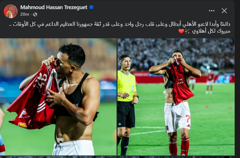 تحيا مصر، وكتب تريزيجيه عبر حسابه الرسمي"إنستجرام": دائمًا وأبدا لاعبو الأهلي أبطال وعلى قلب رجل واحد وعلى قدر ثقة جمهورنا العظيم الداعم في كل الأوقات .. مبروك لكل أهلاوي".