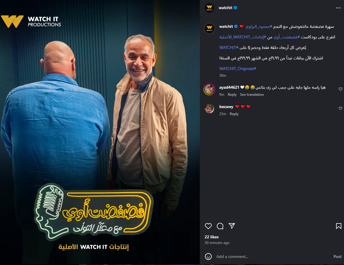 نشرت منصة watch it، البوستر الرسمي الرسمي لحلقة محمود البزاوي، وفقا لما رصده موقع تحيا مصر، عبر صفحتها الرسمية على موقع التواصل الاجتماعي إنستجرام، وعلقت عليها: سهرة فضفضة ماتتعوضش مع النجم محمود البزاوي.
