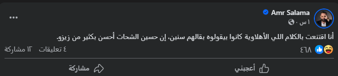 وكتب المخرج عمرو سلامة، منشورا يعلق من خلاله على مباراة الاهلي والزمالك، وفقا لما رصده موقع تحيا مصر، عبر صفحته الرسمية على موقع التواصل الاجتماعي فيسبوك، قال فيه: انا اقتنعت بالكلام اللي الأهلاوية بيقولوا بقالهم سنين، ان حسين الشحات احسن بكتير من زيزو.