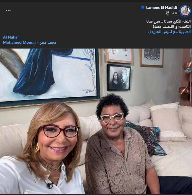 نشرت الإعلامية لميس الحديدي، صورة تجمعها بالفنان الكبير محمد منير، وفقا لما رصده موقع تحيا مصر، عبر صفحتها الرسمية على موقع التواصل الاجتماعي فيسبوك، وعلقت عليها: الليلة الكنج معانا، مين قدنا، التاسعة والنصف مساءً، الصورة مع لميس الحديدي.