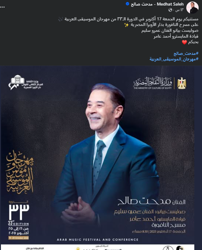 وشارك الفنان مدحت صالح، البوستر الخاص بحفله في فعاليات مهرجان الموسيقى العربية الدورة الـ 33، وفقا لما رصده موقع تحيا مصر، عبر صفحته الرسمية على موقع التواصل الاجتماعي فيسبوك، وعلق عليه: مستنيكم يوم الجمعة 17 أكتوبر في الدورة الـ33 من مهرجان الموسيقى العربية، على مسرح النافورة بدار الأوبرا المصرية، صوليست بيانو الفنان عمرو سليم، قيادة المايسترو أحمد عامر، بحبكم.
