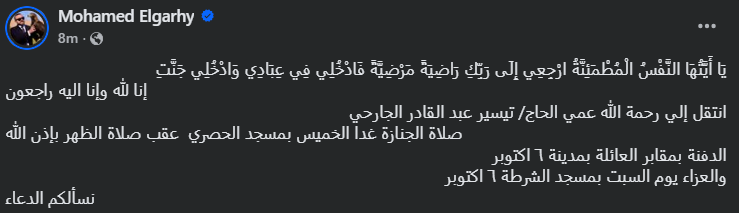 تحيا مصر، وكتب محمد الجارحي عبر حسابه الرسمي"فيس بوك": يَا أَيَّتُهَا النَّفْسُ الْمُطْمَئِنَّةُ ارْجِعِي إِلَى رَبِّكِ رَاضِيَةً مَرْضِيَّةً فَادْخُلِي فِي عِبَادِي وَادْخُلِي جَنَّتِ إنا لله وإنا اليه راجعون، انتقل إلي رحمة الله عمي الحاج/ تيسير عبد القادر الجارحي ، صلاة الجنازة غدا الخميس بمسجد الحصري عقب صلاة الظهر بإذن الله ،الدفنة بمقابر العائلة بمدينة ٦ اكتوبر، والعزاء يوم السبت بمسجد الشرطة ٦ اكتوبر".