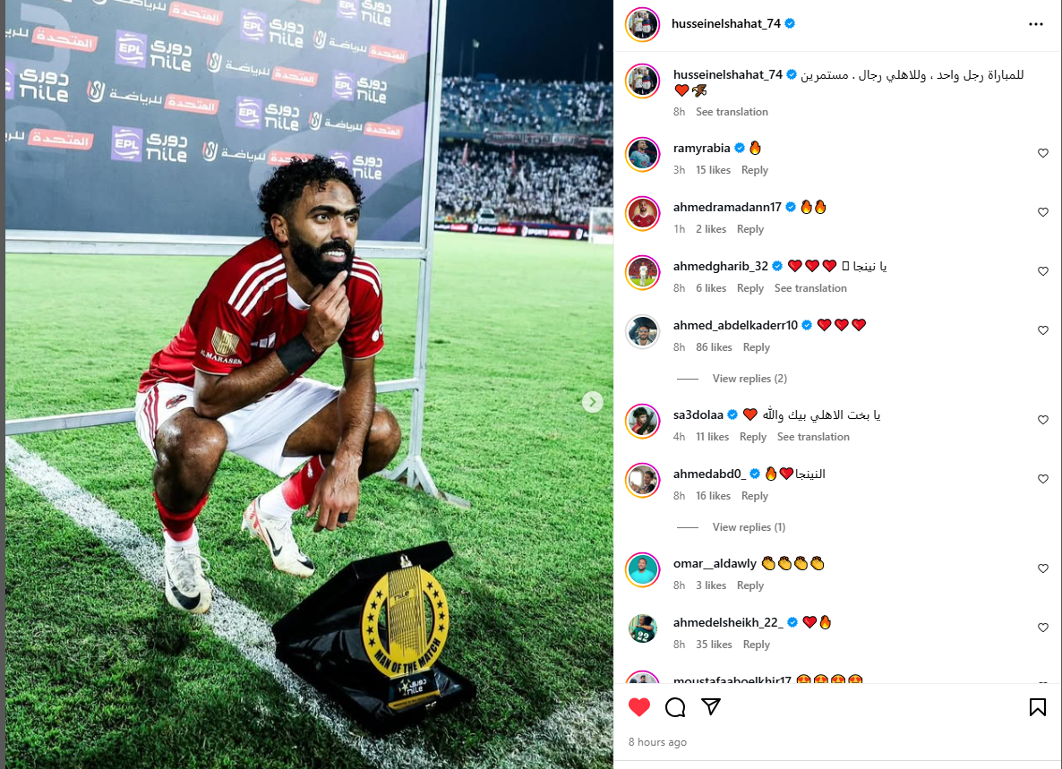 تحيا مصر، وكتب حسين الشحات عبر حسابه الرسمي" إنستجرام":" للمباراة رجل واحد وللأهلي رجال مستمرين".